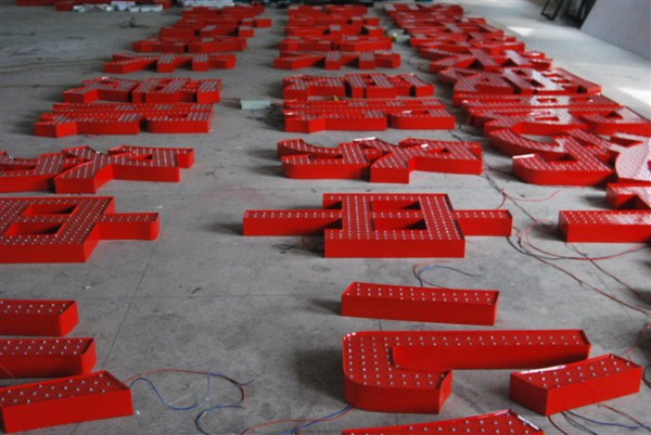 外露發(fā)光字又被稱為不銹鋼沖孔發(fā)光字、鈦金字、鋅鐵字等,分別由不銹鋼板,鈦金板,鍍鋅鐵板沖孔后,裝上LED防水燈串制作而成。在制作前要先選好材料,做什么字,選什么材料,根據(jù)字體大小,安裝的位置和客戶的要求,選擇相應(yīng)的板材,然后把整張的板材用機床進(jìn)行沖孔,然后用刻機對面板刻出字形,然后把刻好的字焊接成立體邊,再進(jìn)行打磨光滑,避免毛刺。然后就是噴烤油漆,油漆干后,就可以裝LED單顆燈串了,裝燈串的時候務(wù)必要考慮能夠方便接線,每顆燈用橡膠套做風(fēng)水處理,這么做也比較有利于后期對外露發(fā)光字進(jìn)行維護(hù)。